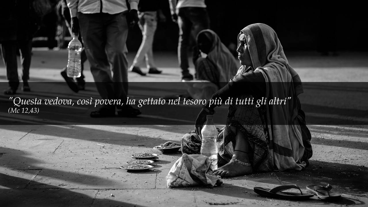 Allora, chiamati a sé i suoi discepoli, disse loro: «In verità io vi dico: questa vedova, così povera, ha gettato nel tesoro più di tutti gli altri. Tutti infatti hanno gettato parte del loro superfluo. Lei invece, nella sua miseria, vi ha gettato tutto quello che aveva, tutto quanto aveva per vivere